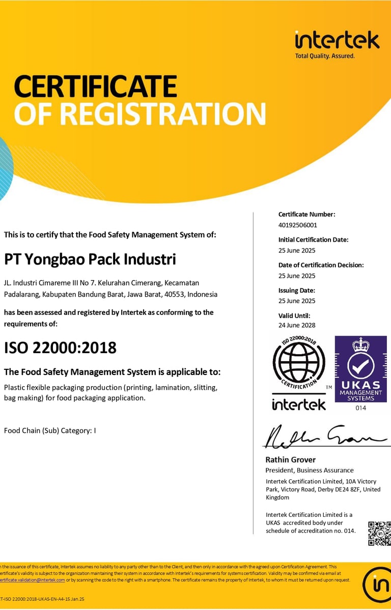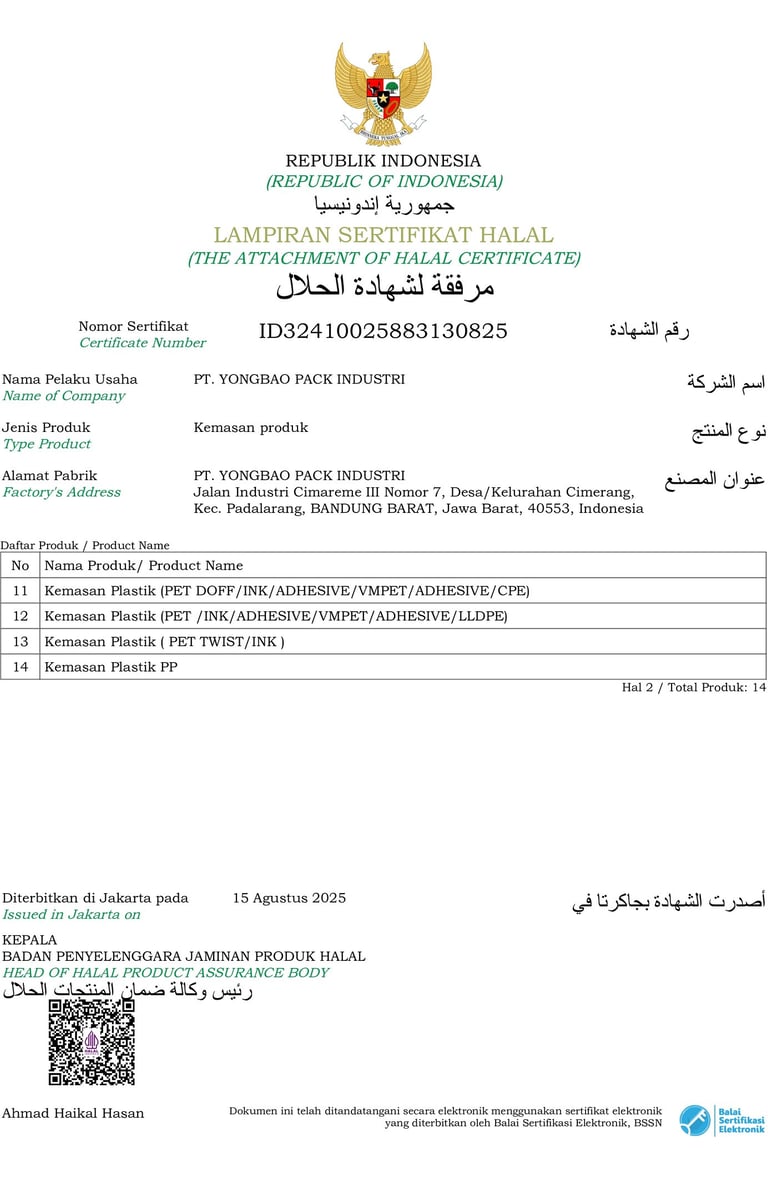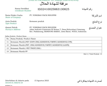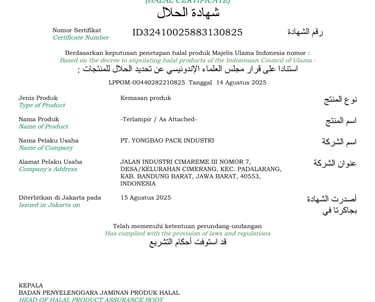PT. Yongbao Pack Industri adalah perusahaan terkemuka di Indonesia yang bergerak di bidang percetakan kemasan makanan. Berlokasi di Kabupaten Bandung Barat, perusahaan ini mendedikasikan diri untuk menyediakan solusi pengemasan yang inovatif, higienis, dan berkualitas tinggi bagi para pelaku industri makanan dan minuman, mulai dari usaha kecil dan menengah (UKM) hingga perusahaan besar.