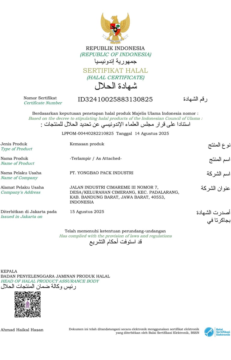 Kemasan dari PT Yongbao Pack Industri sangat berkualitas dan inovatif. Sangat membantu dalam memperkuat identitas merek kami.